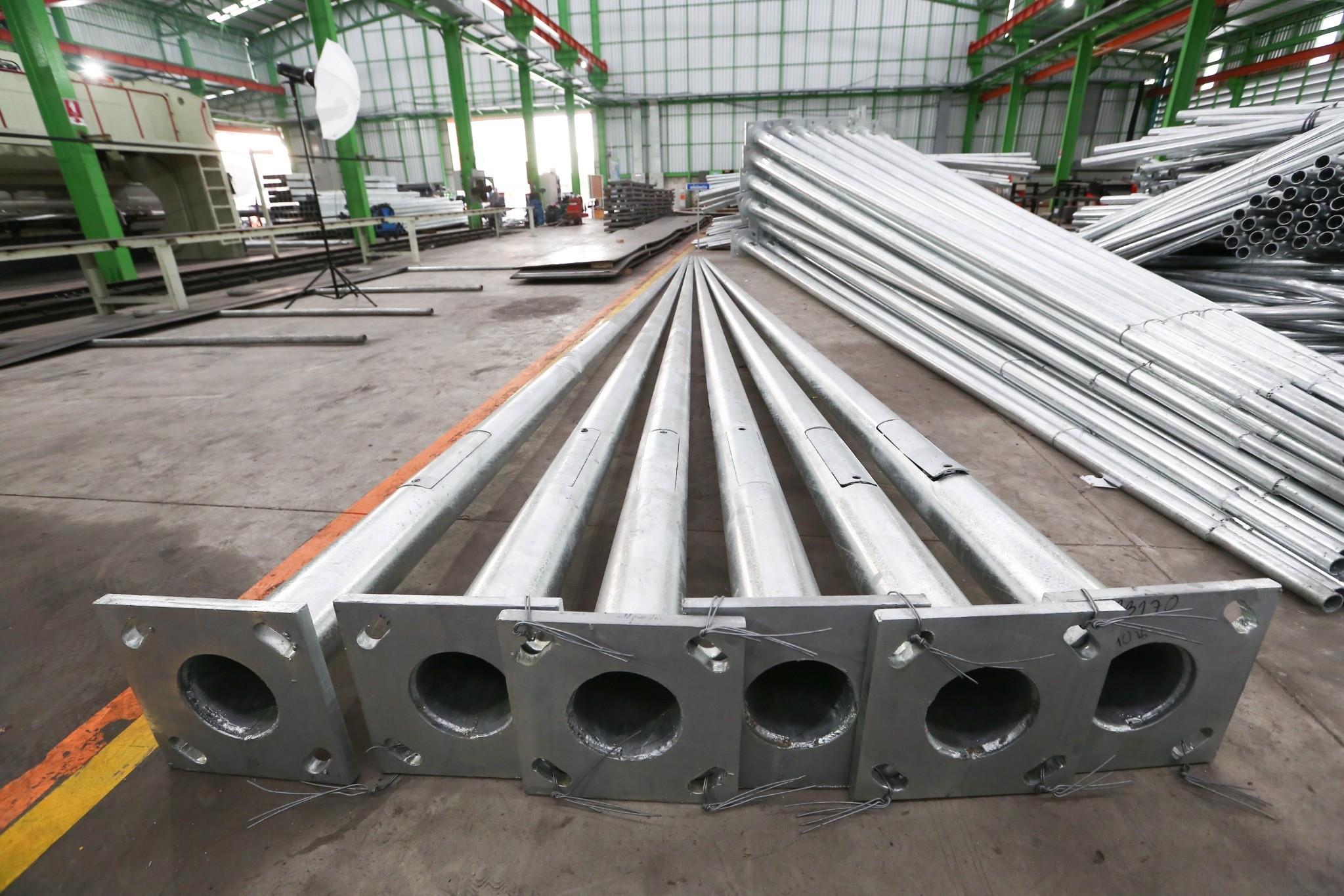 - เสากลมและเสาเหลี่ยมปลายเรียว ชุบกัลวาไนซ์ ความสูง 5 เมตร ผลิตจากเหล็กคุณภาพสูง ชุบสังกะสีแบบจุ่มร้อนตามมาตรฐาน ASTM A123